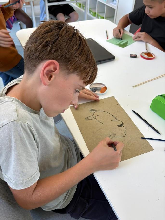 Wanneer kinderen zich buigen over de prehistorie, lijkt het verleden plots veel dichterbij. Het zesde leerjaar ontdekte dat kunst niet begint met verf uit een tube of penseelstreken op een doek, maar met eenvoudige middelen: pigmenten, olie en houtskool. Wat duizenden jaren geleden vanzelfsprekend was, krijgt in het klaslokaal opnieuw betekenis.